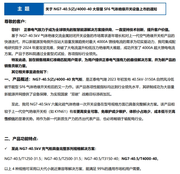 關(guān)亍 NG7-40.5(Z)/4000-40 大容量 SF6 氣體絕緣開關(guān)設(shè)備上市的通知