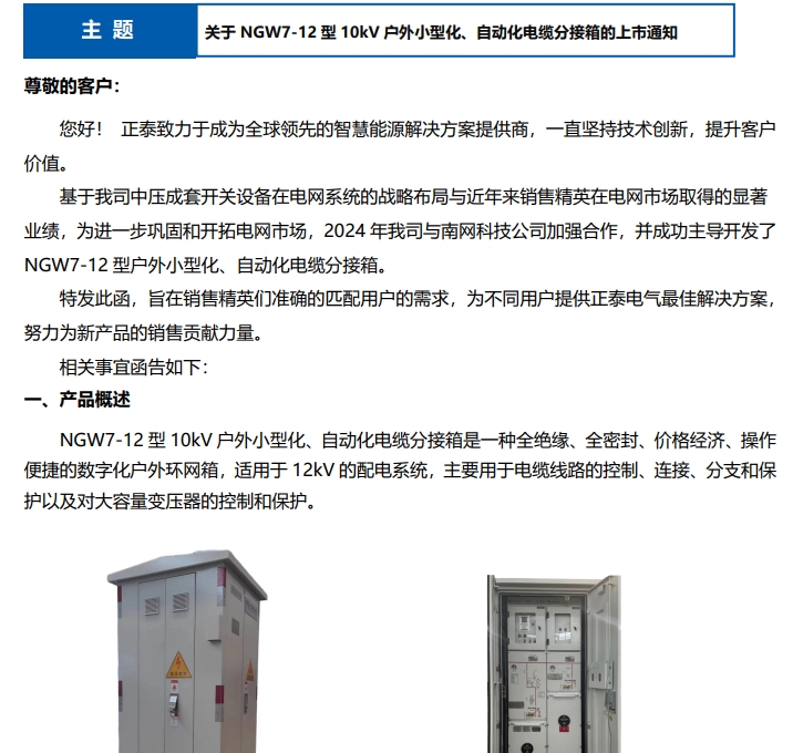 關(guān)于 NGW7-12 型 10kV 戶外小型化、自動(dòng)化電纜分接箱的上市通知