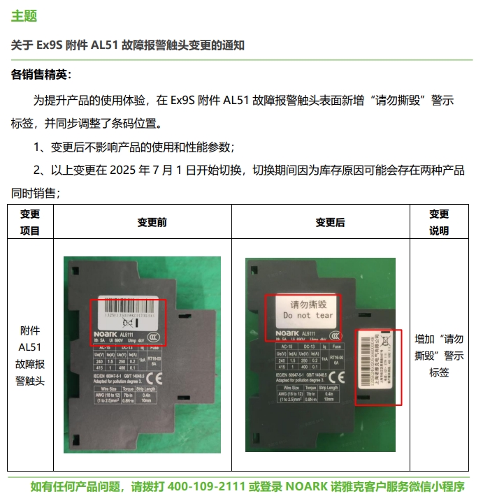 關(guān)于 Ex9S 附件 AL51 故障報警觸頭變更的通知