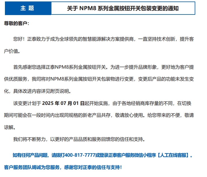 關于 NPM8 系列金屬按鈕開關包裝變更的通知