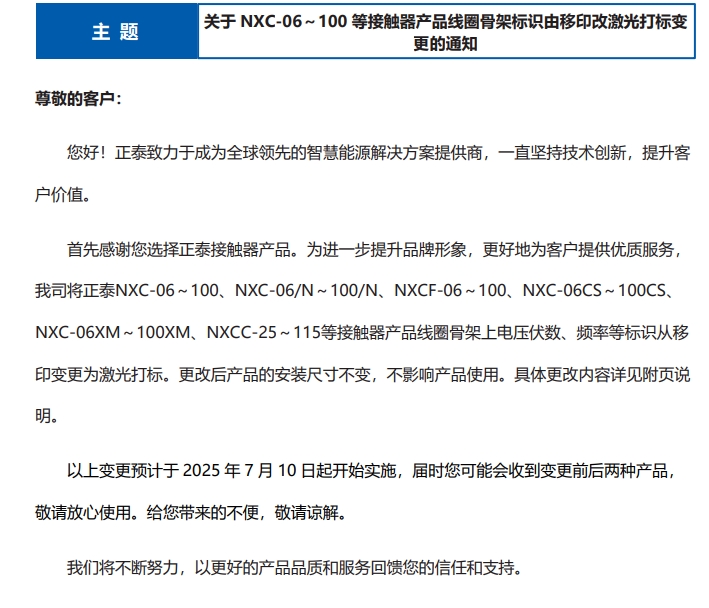 關(guān)于 NXC-06~100 等接觸器產(chǎn)品線圈骨架標(biāo)識(shí)由移印改激光打標(biāo)變 更的通知
