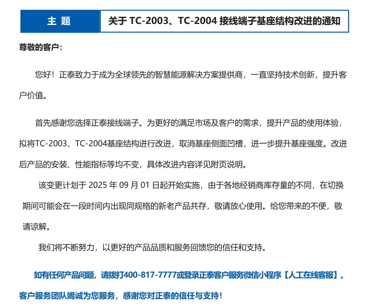 關(guān)于 TC-2003、TC-2004 接線端子基座結(jié)構(gòu)改進(jìn)的通知