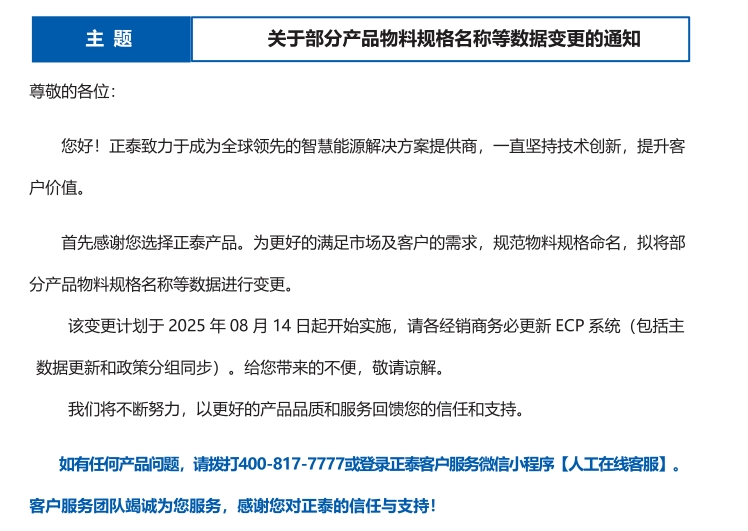 關于部分產(chǎn)品物料規(guī)格名稱等數(shù)據(jù)變更的通知