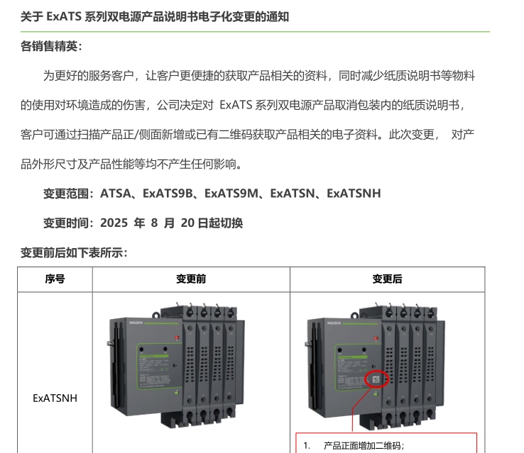 關(guān)于 ExATS 系列雙電源產(chǎn)品說明書電子化變更的通知