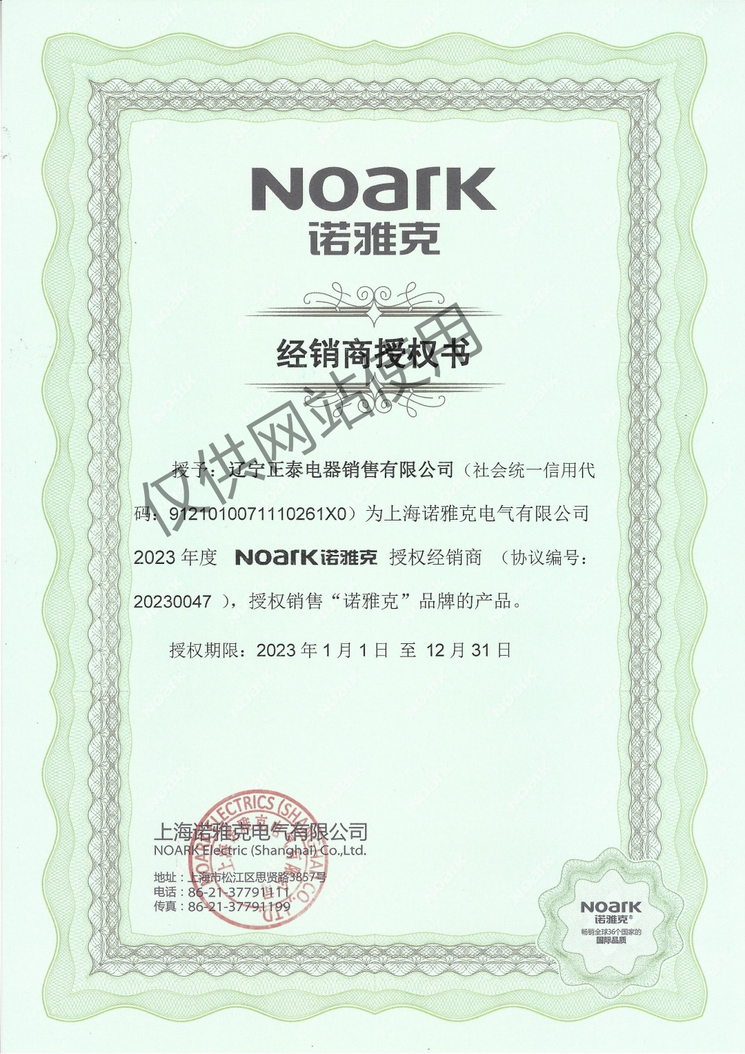 上海諾雅克電氣有限公司授權證書